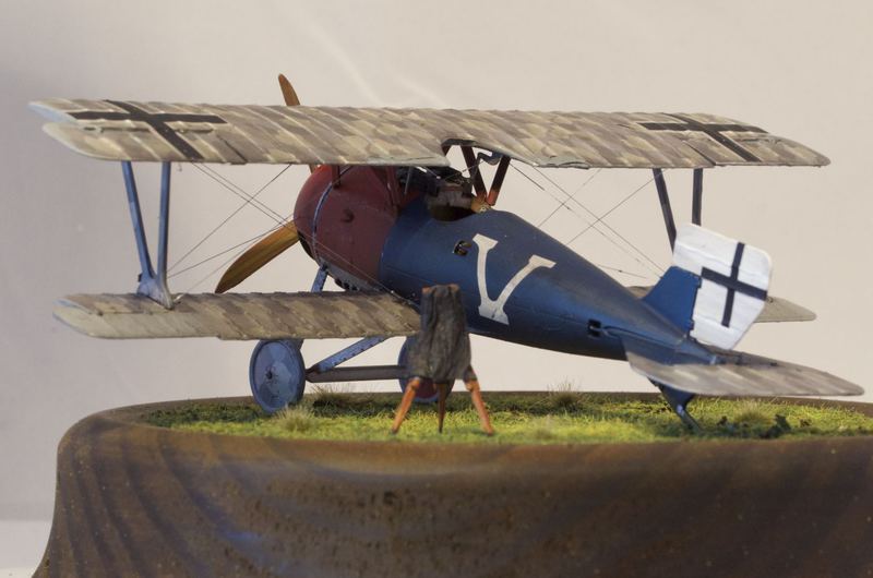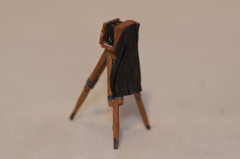 Den Sockel für die SSW D.III, habe ich aus Fichtenholz selbst gederechselt, die Begrünung wurde mit Flocken von Woodland, Faller realisiert. Die Holzkamera enstand scratch, nach Vorbildfotos aus dem Internet.